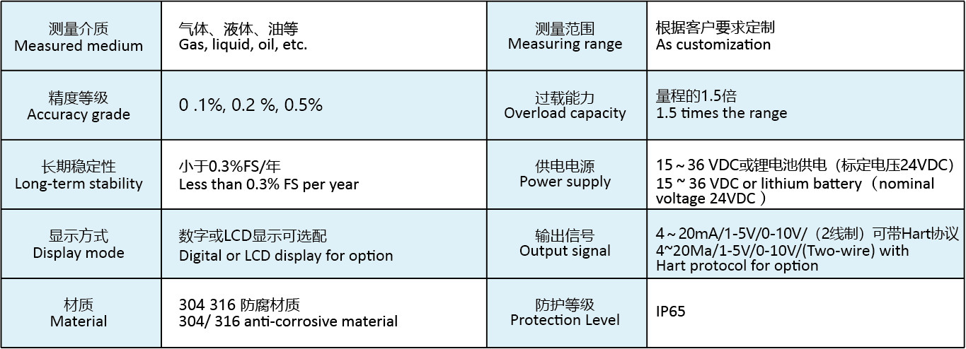 當壓力直接作(zuò)用在測量膜片的表面,使膜片産生(shēng)微小(xiǎo)的形變,測量膜片上(shàng)的高(gāo)精度電(diàn)路将這個(gè)微小(xiǎo)的形變變換成為(wèi)與壓力成正比的高(gāo)度線性、與激勵電(diàn)壓也成正比的電(diàn)壓信号,然後采用專用芯片将這個(gè)電(diàn)壓信号轉換為(wèi)工業标準的4 - 20mA 電(diàn)流信号或者 1 -5V 電(diàn)壓信号。由于測量膜片采用标準話(huà)集成電(diàn)路,內(nèi)部包含線性及溫度補償電(diàn)路,所以可(kě)以做(zuò)到高(gāo)精度和(hé)高(gāo)穩定性,變送電(diàn)路采用專用的兩線制(zhì)芯片輸出 4 -20mA 電(diàn)流信号對應被測介質的壓力範圍。