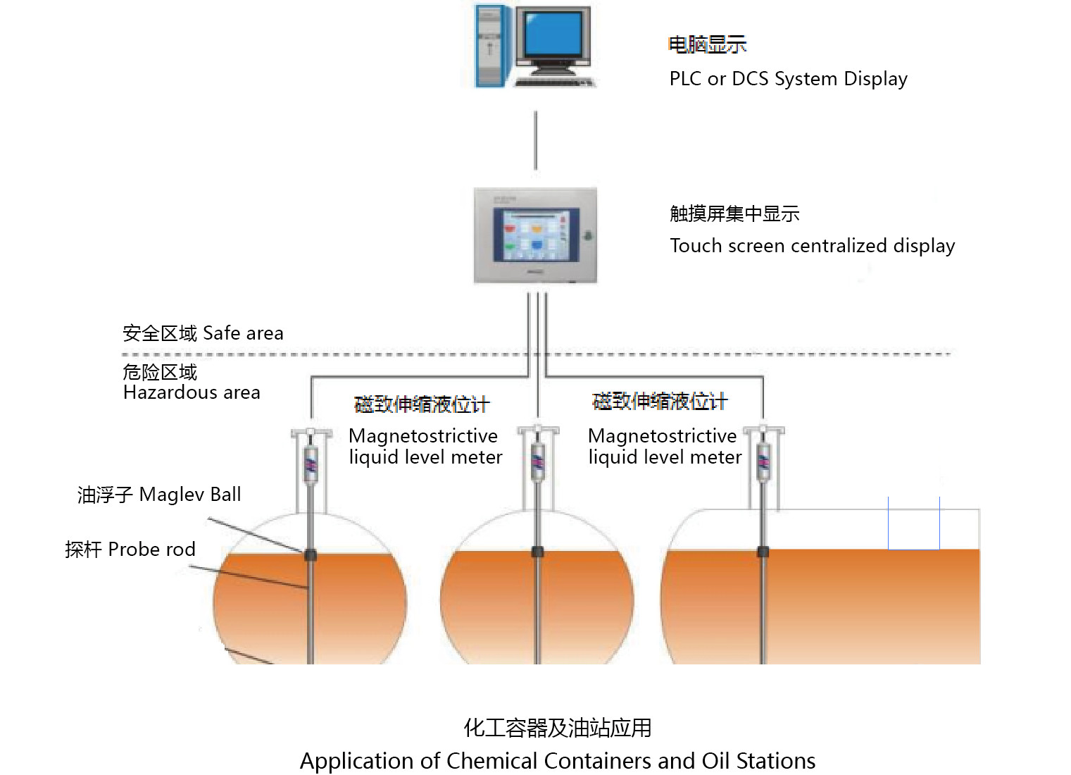 磁緻伸縮液位計(jì)工作(zuò)時(shí),變送器(qì)的觸發電(diàn)路部分激勵出脈沖電(diàn)流,電(diàn)流沿磁緻伸縮線傳播産生(shēng)脈沖電(diàn)流磁場(chǎng)。在磁緻伸縮液位計(jì)的傳感器(qì)測杆外配有(yǒu)磁性浮子,浮子沿測杆随液位的變化而發生(shēng)位移。在浮子內(nèi)部裝有(yǒu)永久磁環,當脈沖電(diàn)流磁場(chǎng)與浮子磁環磁場(chǎng)相遇時(shí),浮子周圍的磁場(chǎng)發生(shēng)改變從而使磁緻伸縮線在浮子停留的位置産生(shēng)一個(gè)扭轉波脈沖,這個(gè)脈沖以固定的速度沿磁緻伸縮線傳回至變送器(qì)由檢測電(diàn)路檢出。通(tōng)過中央處理(lǐ)器(qì)計(jì)算(suàn)脈沖電(diàn)流與扭轉波脈沖的時(shí)間(jiān)差可(kě)以精确地确定浮子所在的位置,即液面的位置。變送器(qì)模電(diàn)轉換電(diàn)路輸出4~20mA信号或RS485 MODBUS信号,從而實現液位信号遠傳的目的。磁緻伸縮液位計(jì)是基于維拉利效應設計(jì)的遠傳式連續測量液位儀表。适用于敞開(kāi)或密閉容器(qì)內(nèi)的液位或界位的測量。磁緻伸縮液位計(jì)由于其測量精度高(gāo)、維護率低(dī),現成為(wèi)遠傳式連續測量液位儀表的最佳選擇。磁緻伸縮液位計(jì)産品結構合理(lǐ),精度高(gāo)、維護率低(dī)。該産品已經廣泛應用于石油,化工,電(diàn)力,冶金,食品,制(zhì)藥,造紙,水(shuǐ)處理(lǐ)等行(xíng)業的液位測量與液位過程控制(zhì)中。